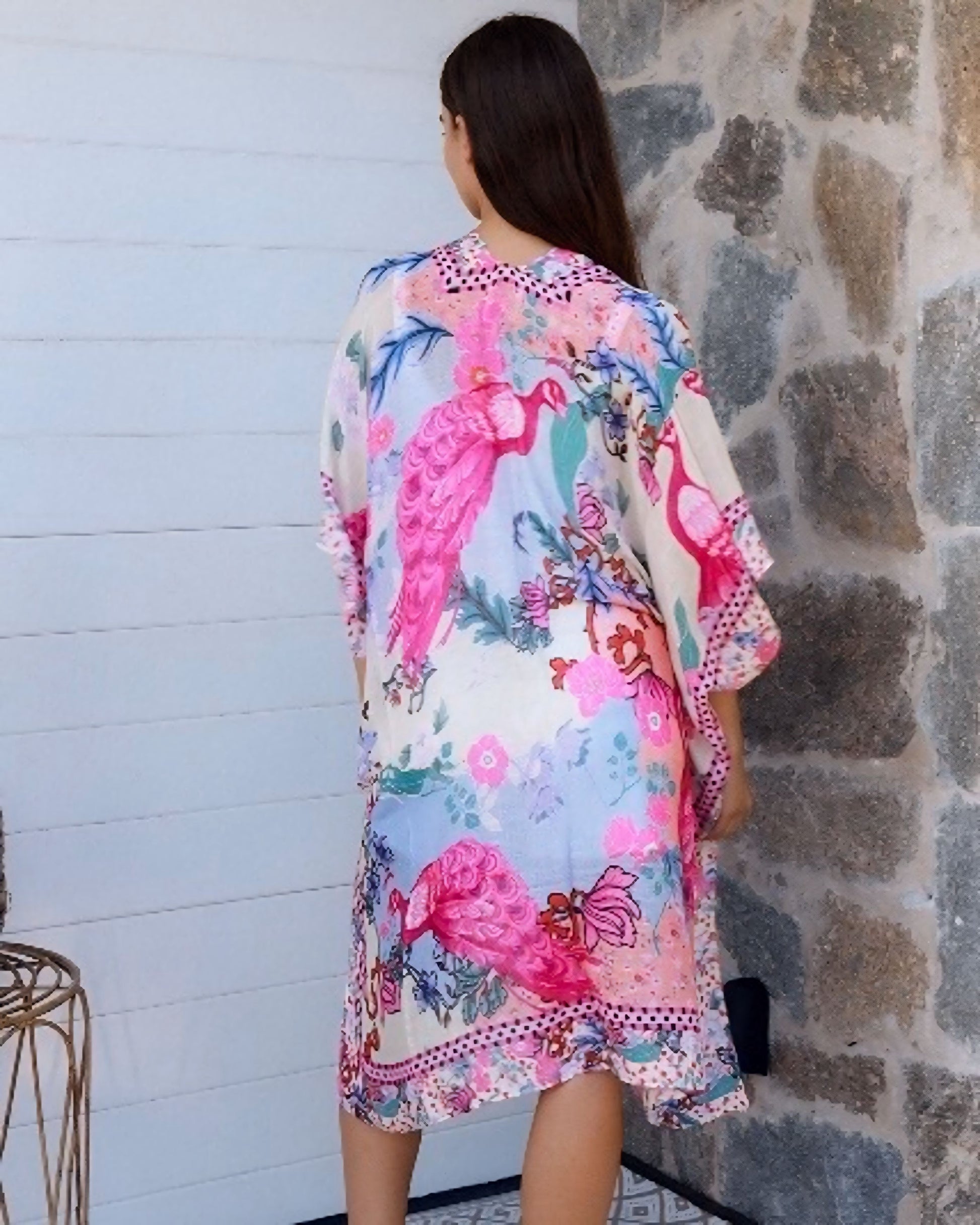 Add a touch of relaxed elegance with our flamingo throw, it's perfect for layering over your favourite costumes or dresses. This versatile throw offers both comfort and chic appeal for this season.